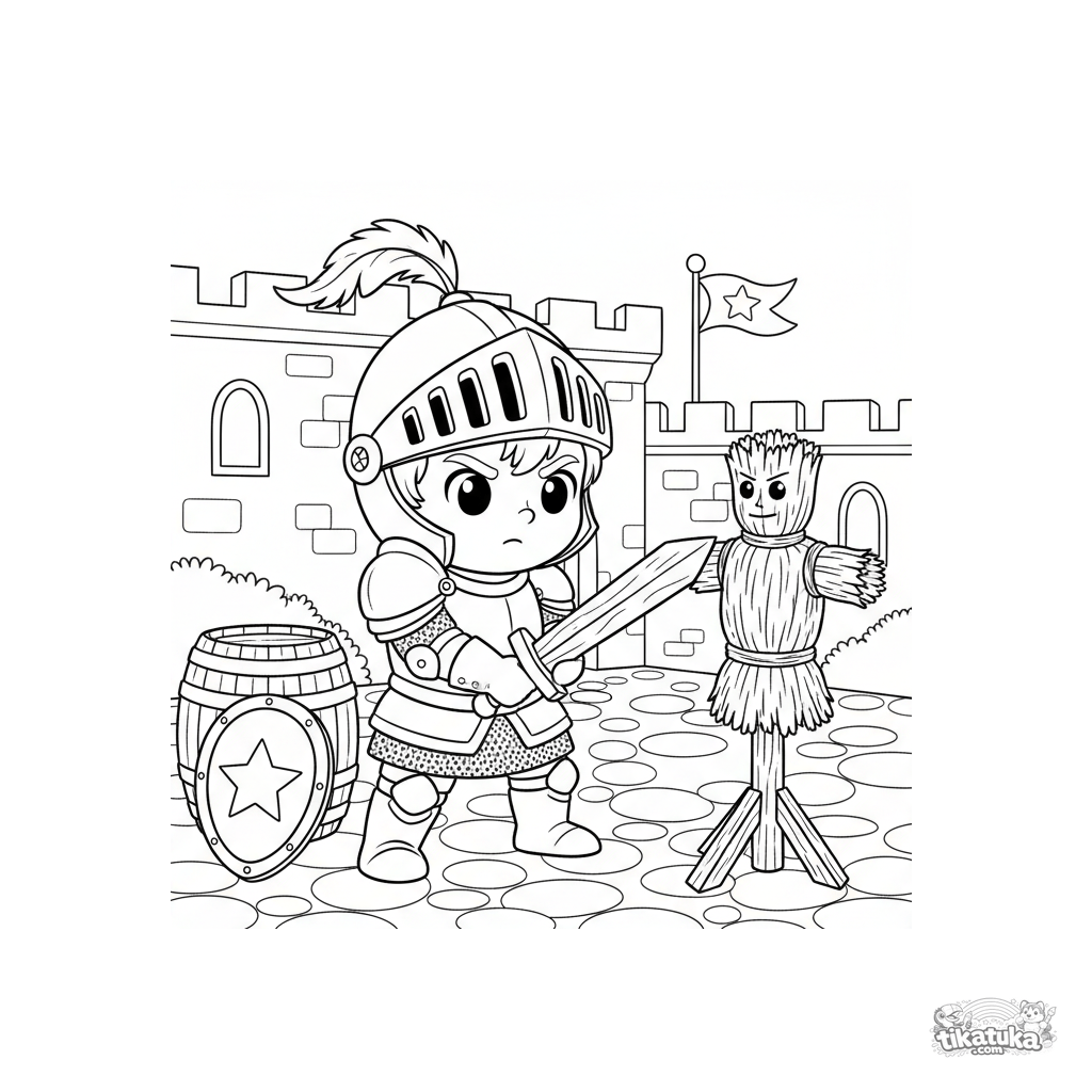 Coloring page of a young knight practicing with a wooden sword against a straw dummy in a castle yard. For kids 5-8. Scene includes a barrel and shield.