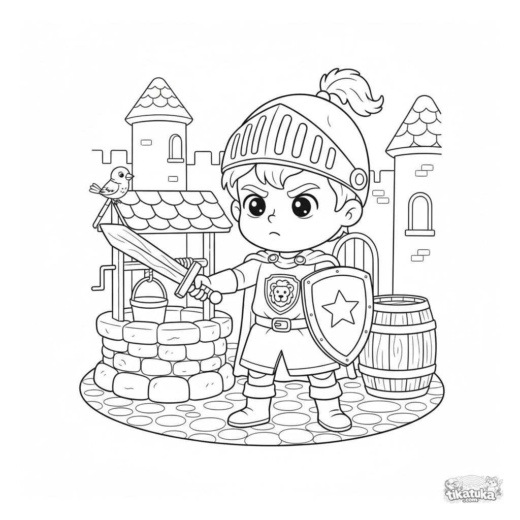 Coloring page of a young knight practicing with a wooden sword and shield in a castle courtyard. For kids aged 5-8. Scene features a stone well, a barrel, and a sparrow.