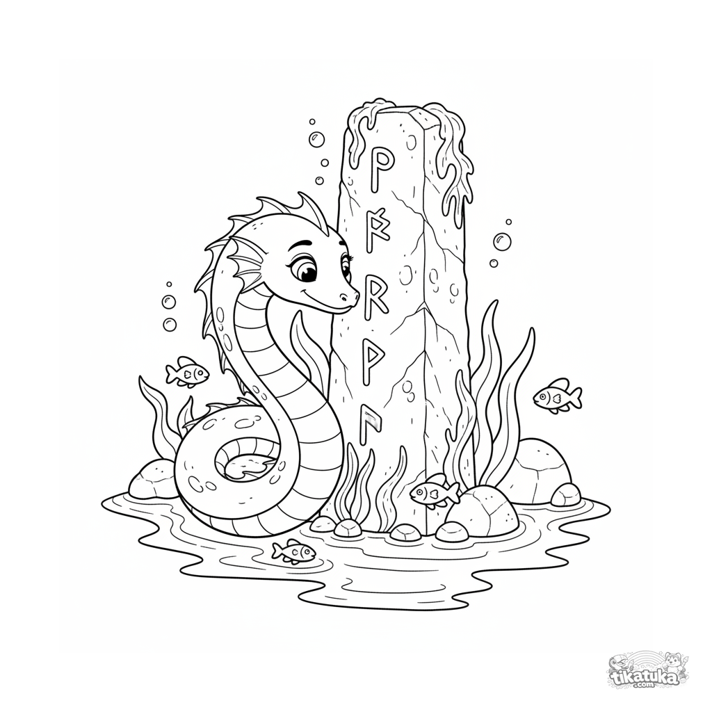 Coloring page for tweens 7-9: a young sea serpent investigates runes on a monolith in a shallow pool. Dynamic pose, interesting scene to color.
