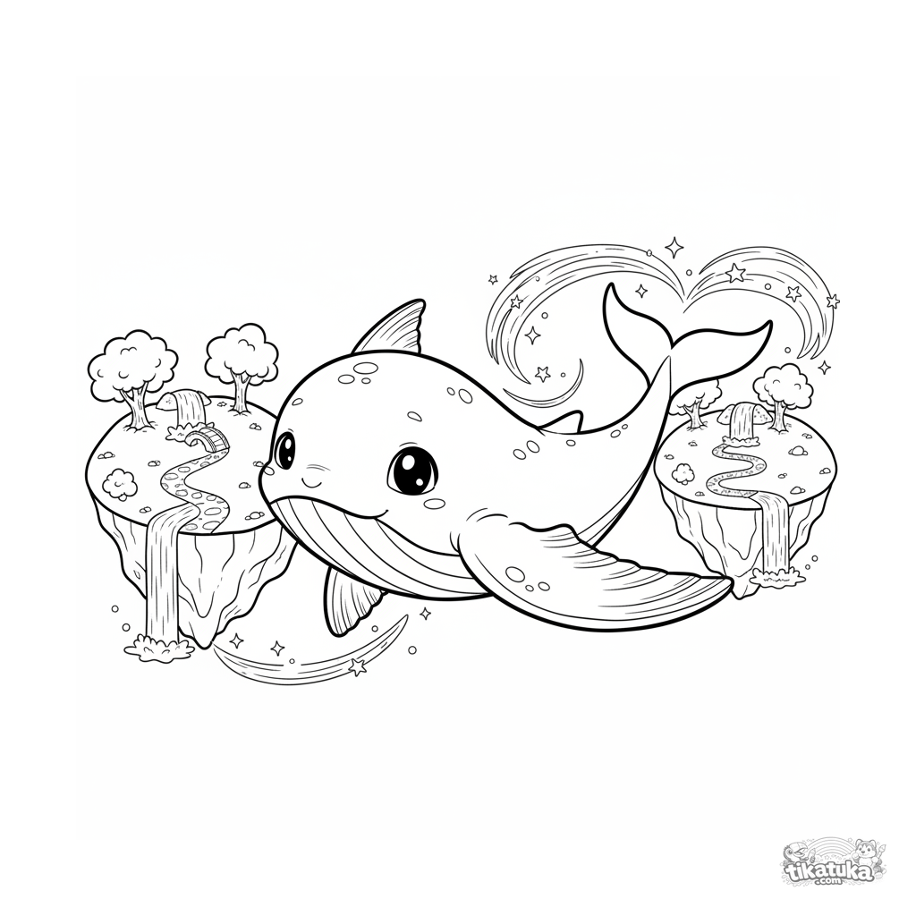 Coloring page for tweens 7-9: a sky whale calf swims among floating islands in the clouds. Magical flight and exploration scene, expressive eyes, wide margins.
