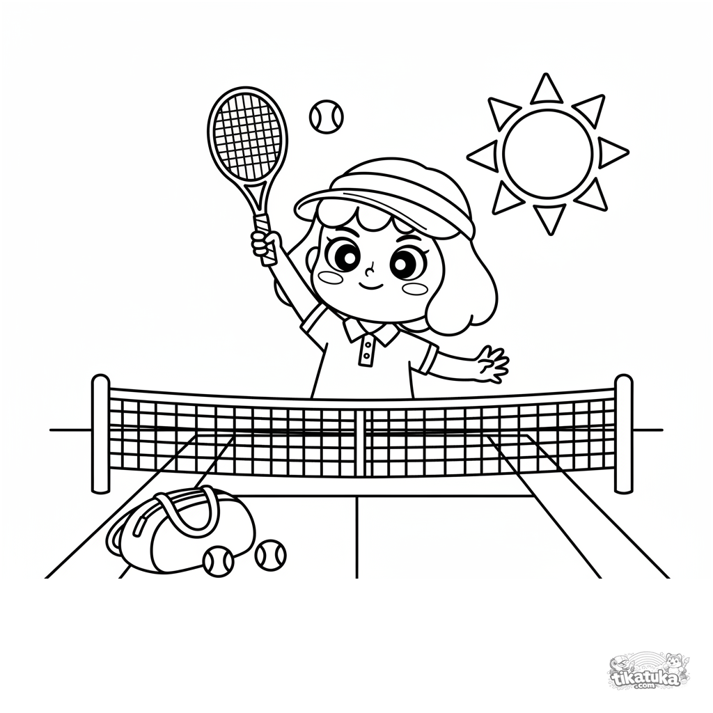 Coloring page for kids 4-6: a young tennis player serving a ball on a court with a net. Simple shapes, friendly character, perfect for beginner artists.