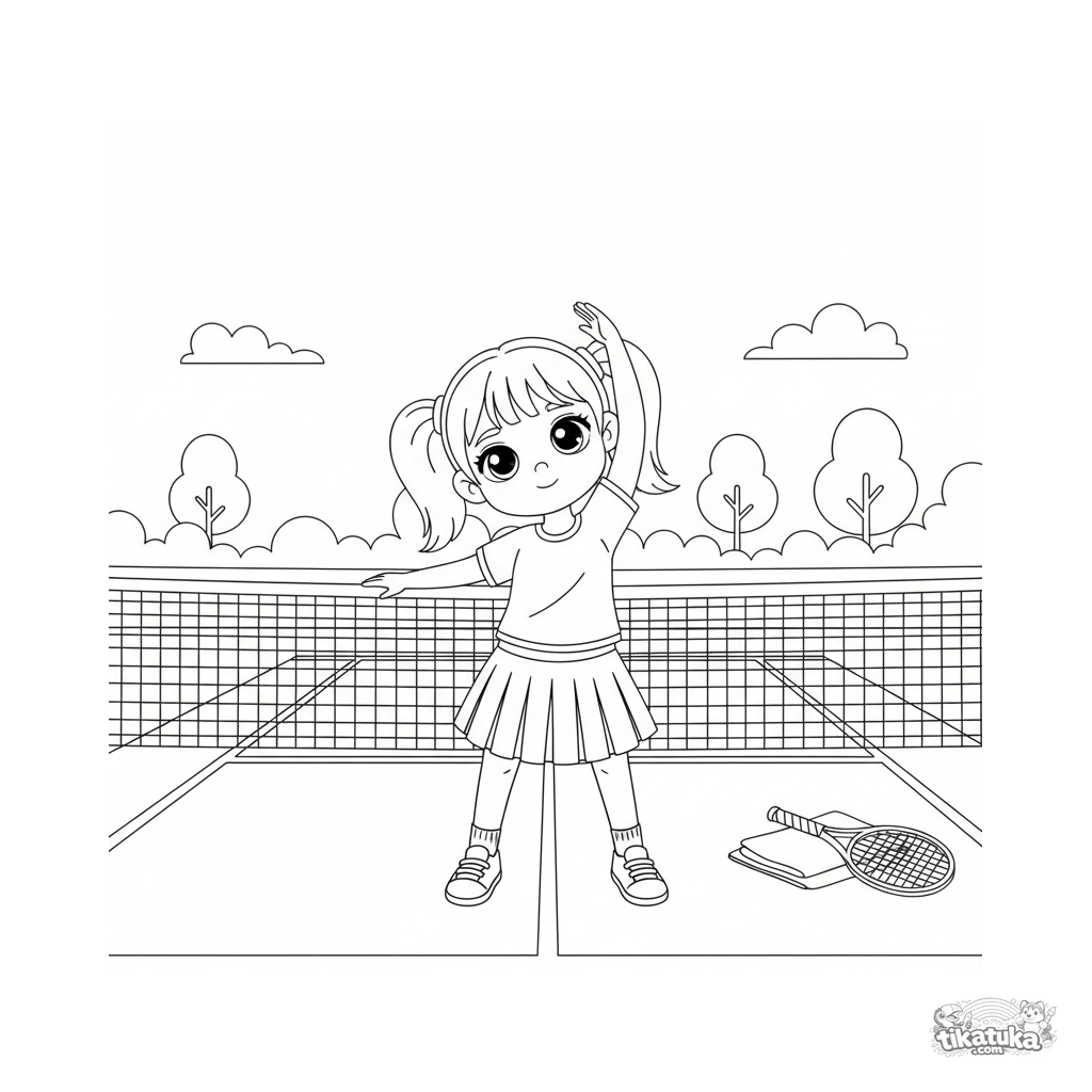 Coloring page for kids 4-6 years: young tennis player stretching at the net on court. Moderate detail, clear shapes.