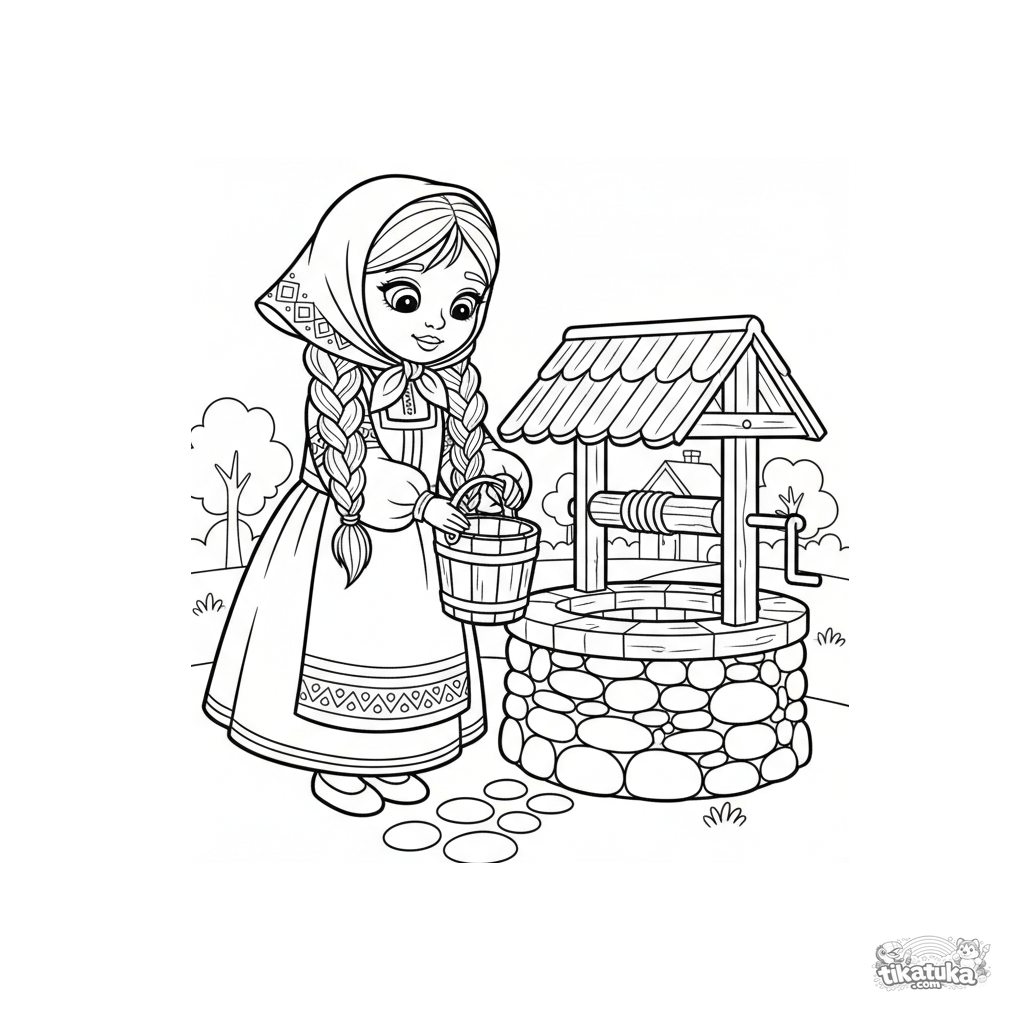 Coloring page for kids 4-6: a girl in folk costume draws water from a magical well of living water. Simple shapes and clear scene.