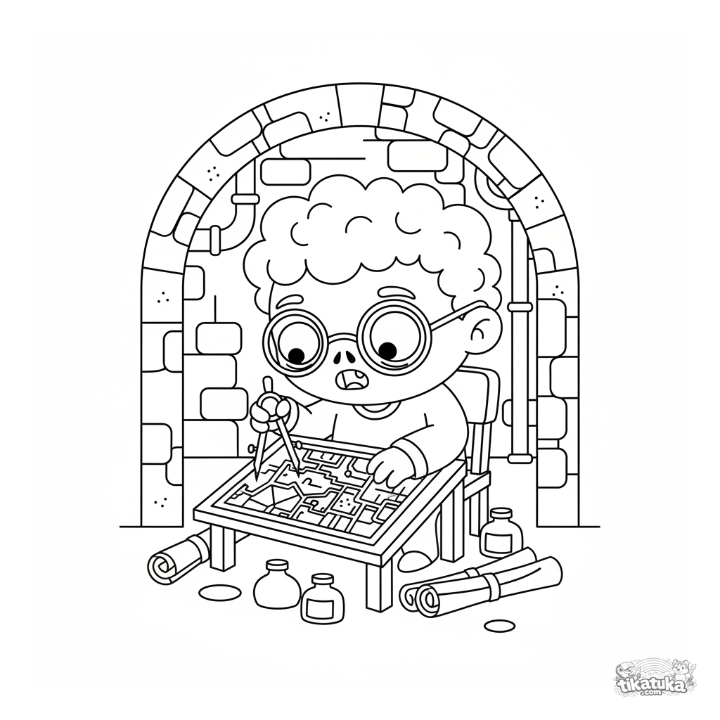 Coloring page for kids 4-6 years old: a studious zombie cartographer draws a map of the tunnels in a cozy nook of the sewer collector. A scene with interesting details to color.