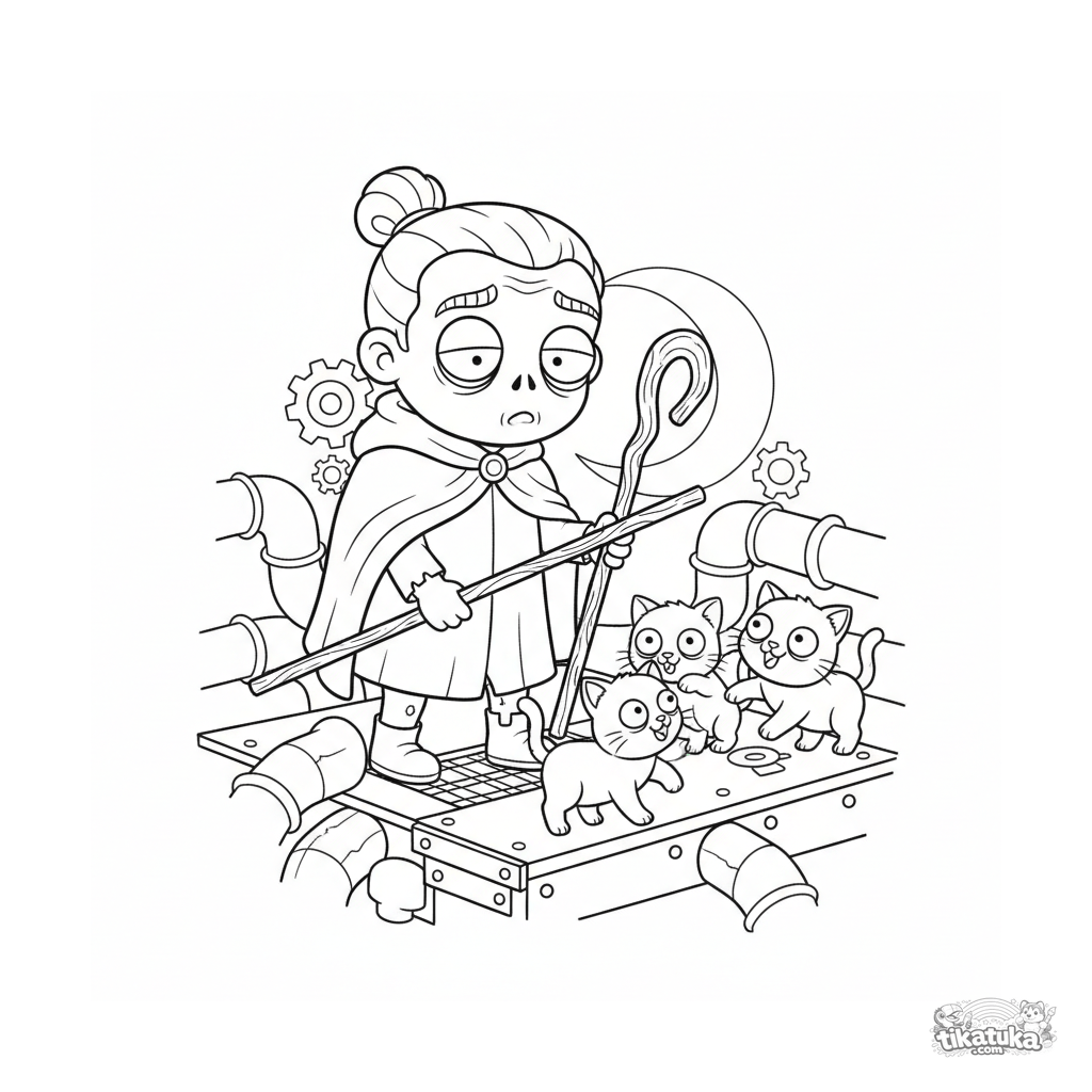 Coloring page for kids 4-6: a kind zombie in a cloak trying to herd zombie kittens on a platform in a sewer. Soft puppet style.