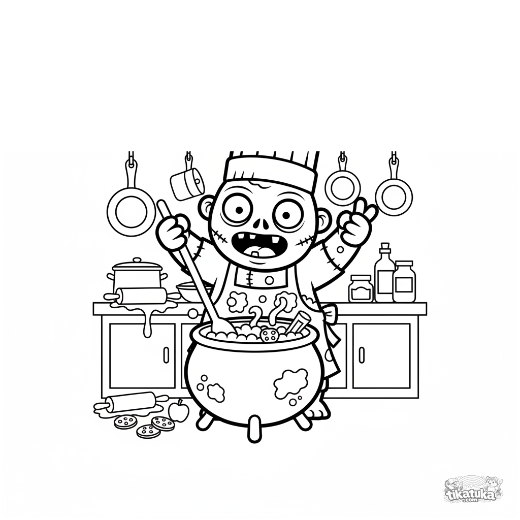 Coloring page for kids 4-6: a friendly zombie in a chef's hat stirs a cauldron in a kitchen. Funny scene, medium detail level.