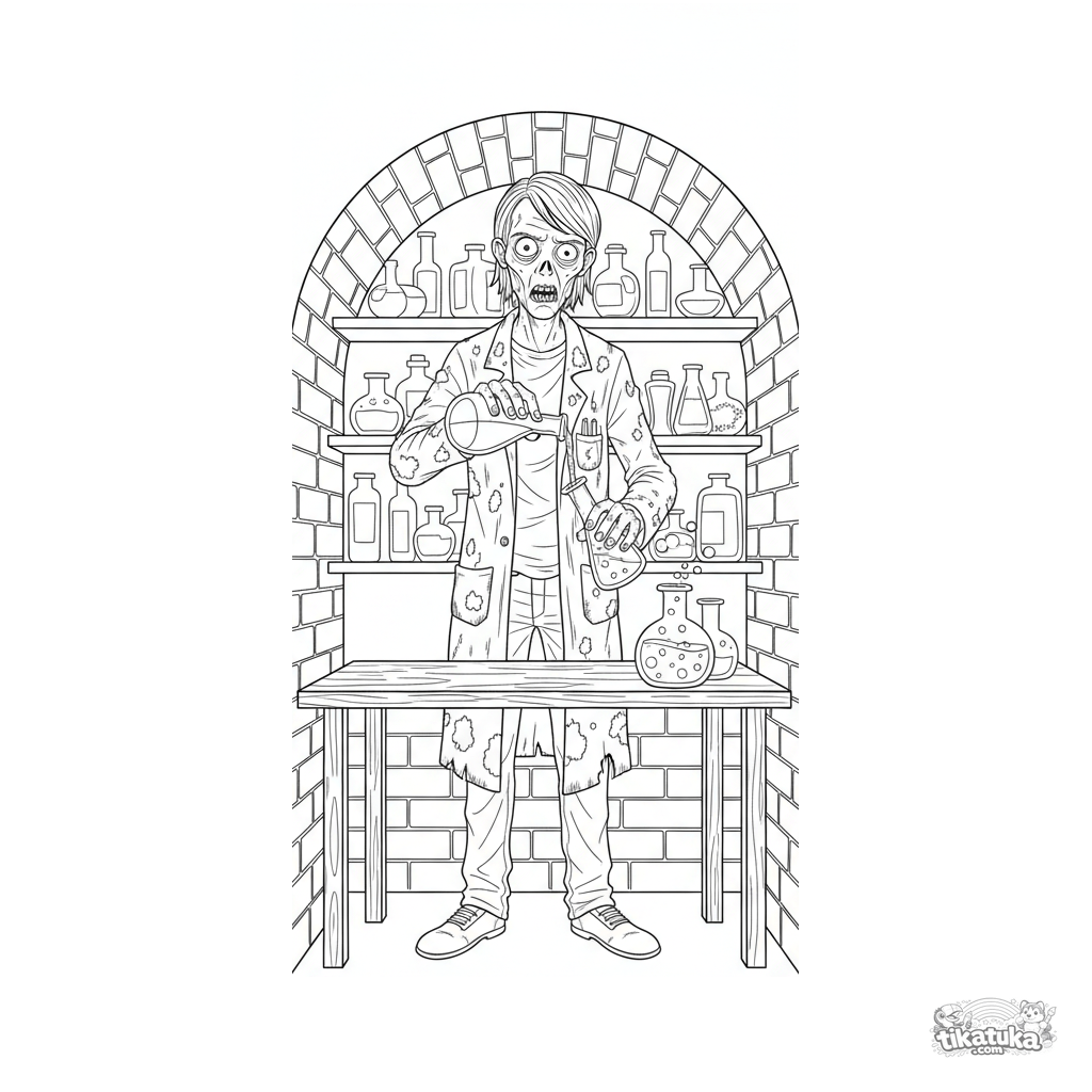 Detailed coloring page for kids 10-12: a zombie chemist conducts an experiment in an underground sewer collector lab. For boys interested in science.
