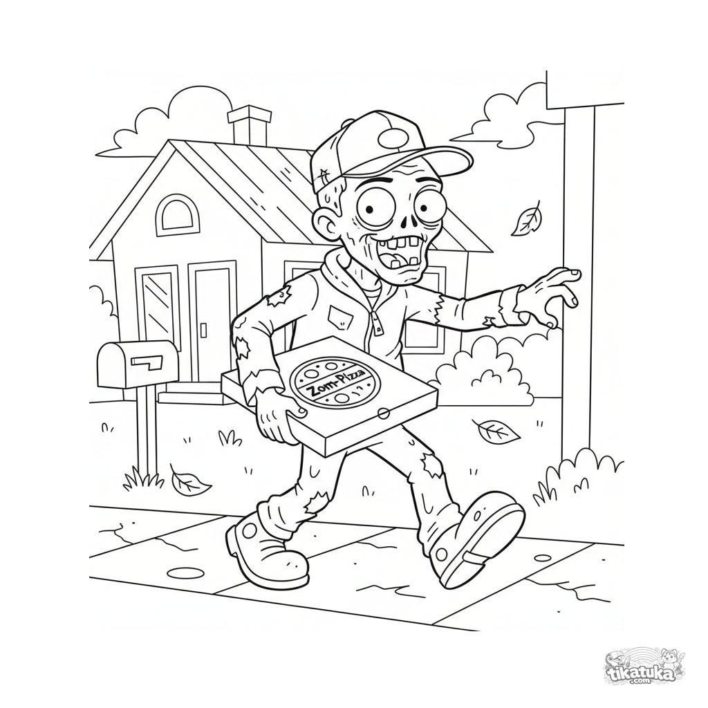 Fun coloring page for boys 4-6: a friendly zombie delivery man carrying a pizza. A cheerful, non-scary scene in a cartoon style.