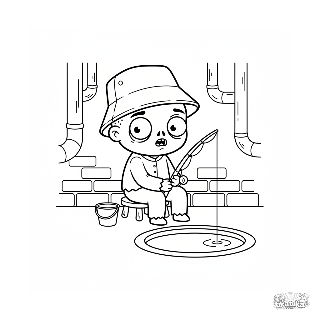 Coloring page for kids 4-6: a relaxed zombie fisherman with a rod sits by a pool in the sewer collector. Soft puppet style, simple scene.