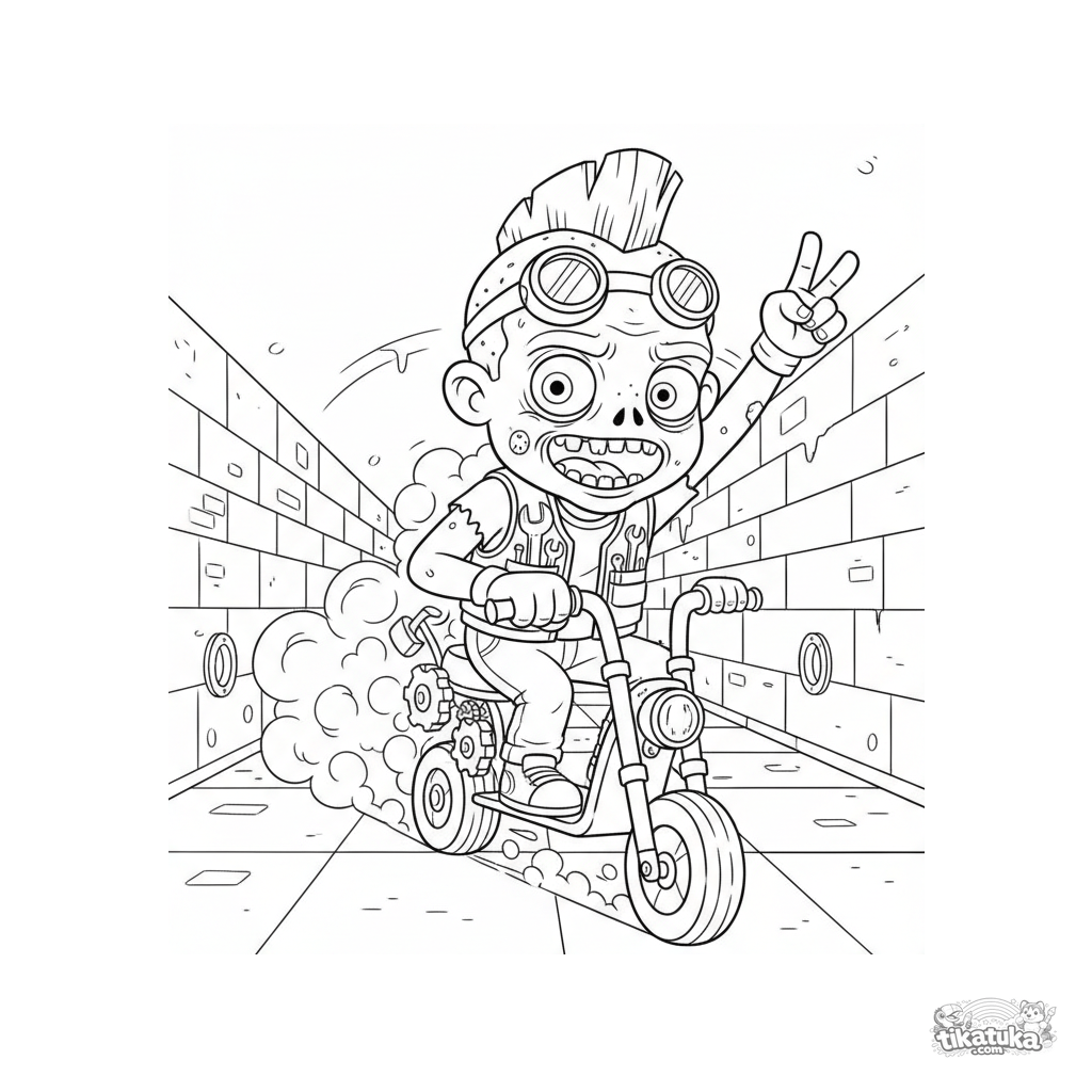 Coloring page for kids 4-6: a zombie mechanic zooming on a homemade scooter down a long sewer collector corridor. Dynamic comic style.