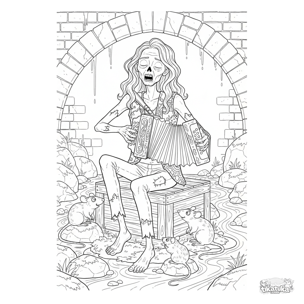 Detailed coloring page for kids 10-12: a zombie musician playing an accordion in a chamber of a sewer tunnel. An atmospheric scene with details.