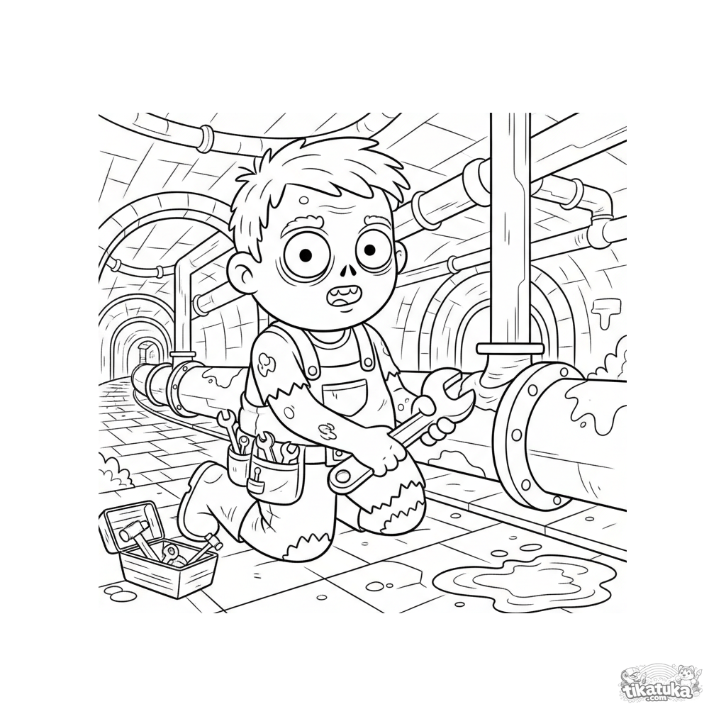 Coloring page for kids 4-6: a friendly zombie plumber fixing a pipe in a large sewer collector. A fun, not-scary scene for creativity.