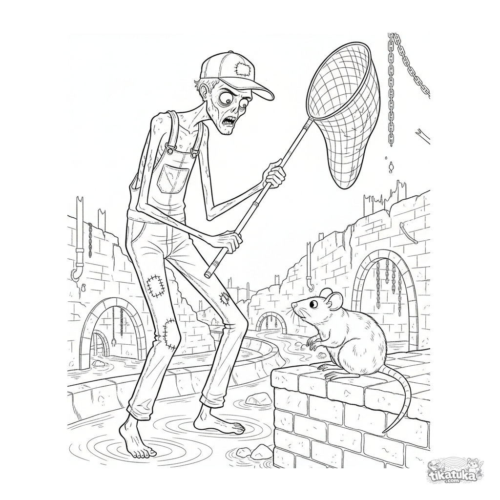 Detailed coloring page for kids 10-12: a zombie rat-catcher with a net in a sewer channel. Realistic style, brick textures, and clothing details.