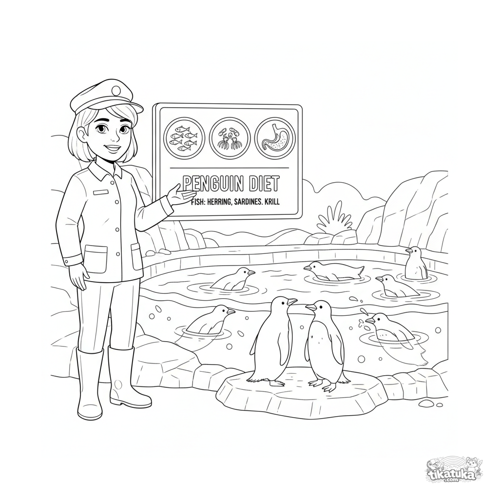 Detailed coloring page for kids 10-12: a zookeeper explains the penguin diet at an information board. An educational scene with realistic details.