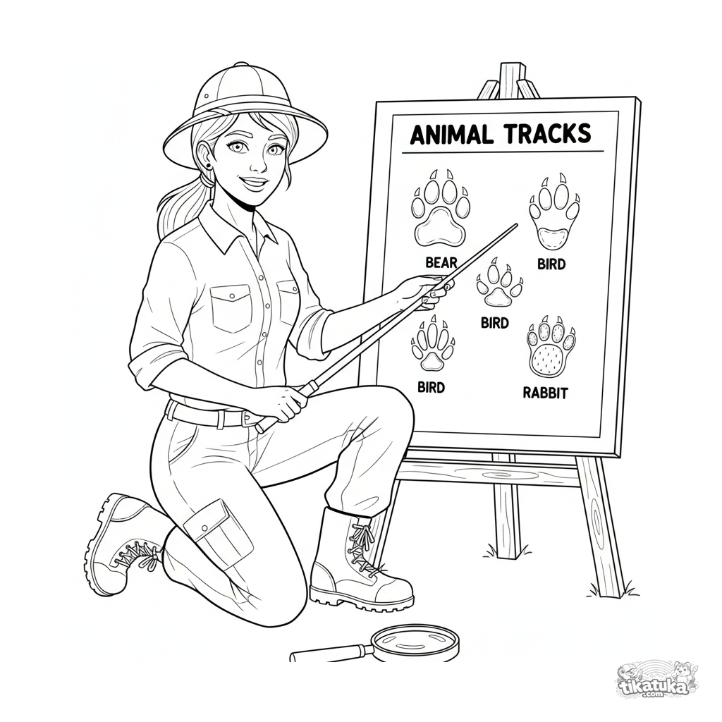 Coloring page for kids 10-12: a zoologist at a zoo information board explains a chart of different animal footprints. Detailed scientific-educational illustration.