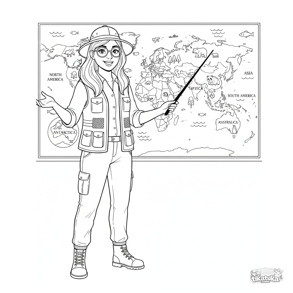Coloring page for kids 10-12: a zoologist explains an animal habitat map on a large informational sign at the zoo. Detailed educational scene about geography and biology.