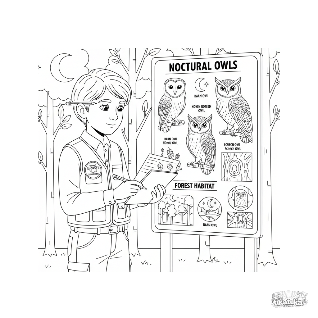 Coloring page for kids 10-12: a junior zoologist sketches notes by an informational sign about owls at the zoo. Detailed educational scene for nature and science lovers.