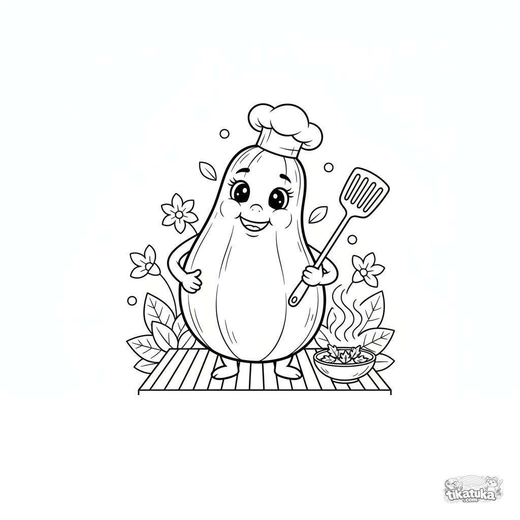 Coloring page for kids 4-6: a smiling zucchini wearing a chef's hat cooks on a garden grill. Simple shapes, summer theme.
