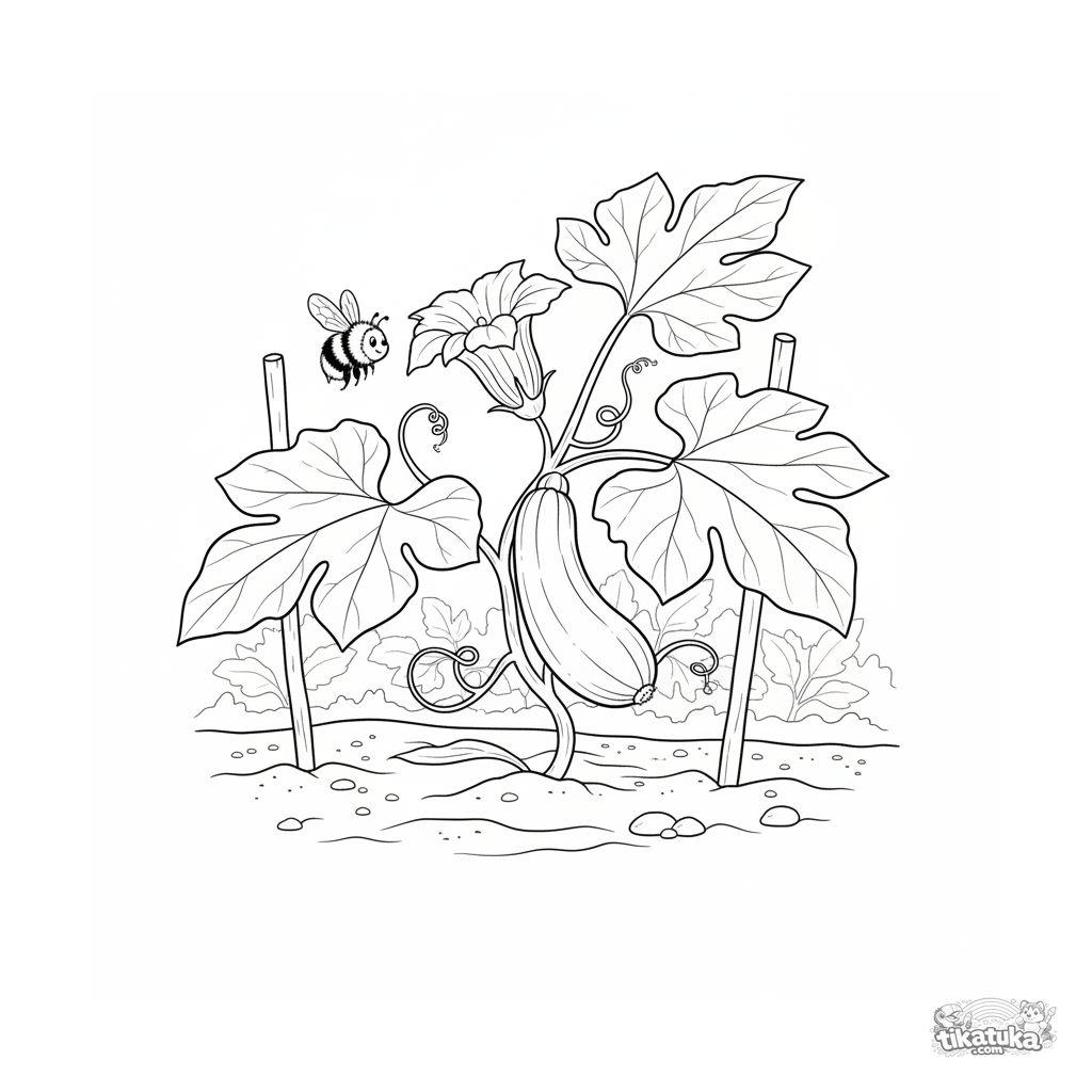 Coloring page for tweens 7-9: a zucchini growing on the vine with leaves and a flower, a bumblebee visiting. Watercolor-sketch style with moderate detail.