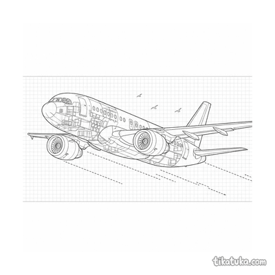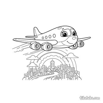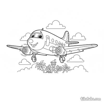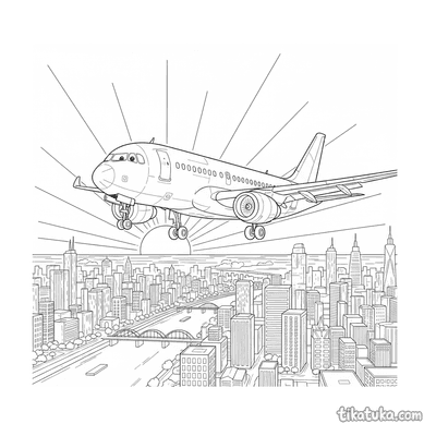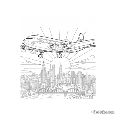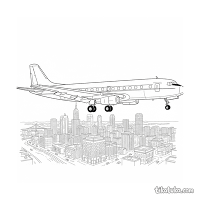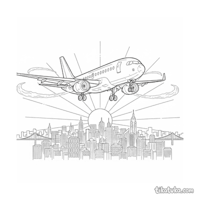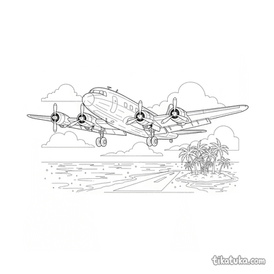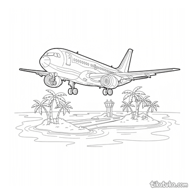 Our airliner pages depict detailed scenes like a 1950s passenger plane taxiing at a terminal, an airliner on its landing approach over a tropical island, and mid-century aircraft parked in open hangars. You'll find dramatic sunset landings over cities and serene approaches to island runways. All 16 airliner drawings are available as clean, black-and-white outlines perfect for coloring. You can download the entire set for a themed activity book or color any scene directly on our website.