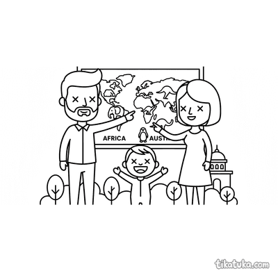 Family at World Map with Animal Habitats