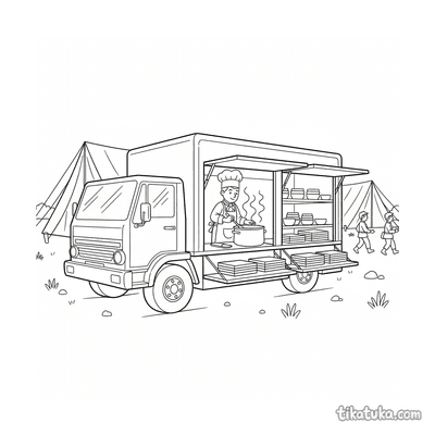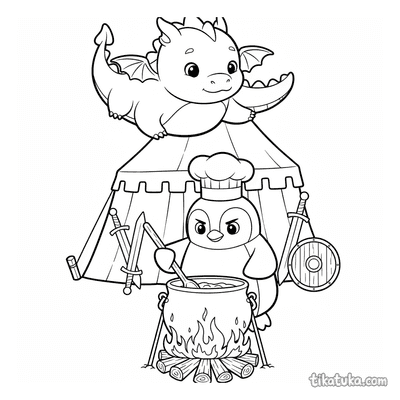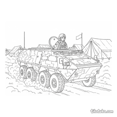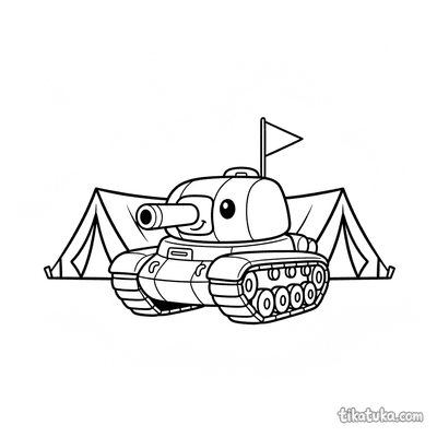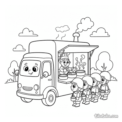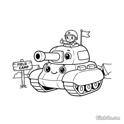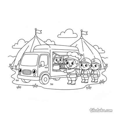 Children can color detailed scenes of a retro pickup at a mountain campsite, a vintage pickup truck at camp, and an armored personnel carrier arriving at camp. The pages also include a field kitchen truck serving food and a penguin cook at a training camp. You can download all 15 camp-themed pages as a single PDF for easy bulk printing. Each illustration has clean, bold outlines perfect for coloring with crayons, markers, or using the online coloring tool.