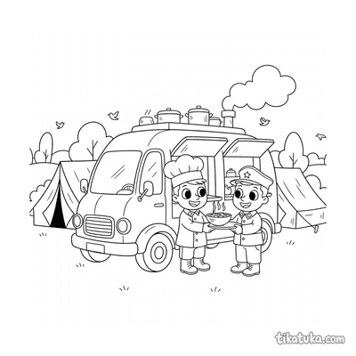 These camp coloring pages capture the spirit of outdoor adventures and life at a campsite. The collection features a variety of vehicles, activities, and characters associated with spending time in nature.