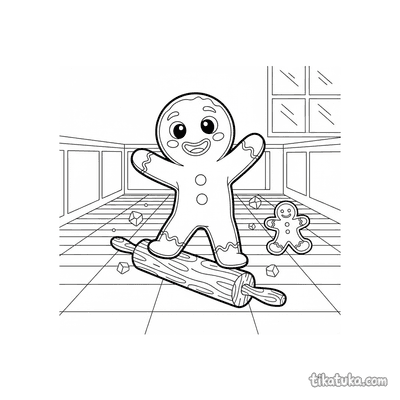 Gingerbread Man Riding Rolling Pin Across Checkerboard Floor