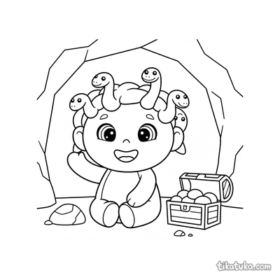 These coloring pages feature the mythical Gorgon from ancient stories. Children can find scenes of Gorgon sisters, snake charmers, and legendary lairs to bring to life.