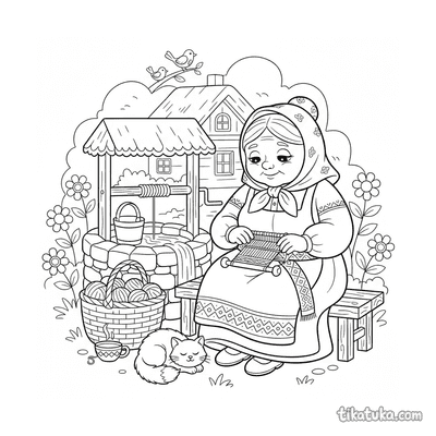 Kindly Grandmother Weaving by the Well
