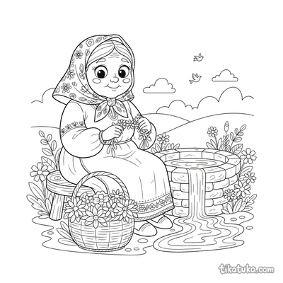 Kindly Grandmother Weaving a Garland at the Well