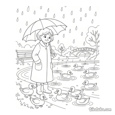 Grandparent with Umbrella Feeding Ducks in Pond Rain