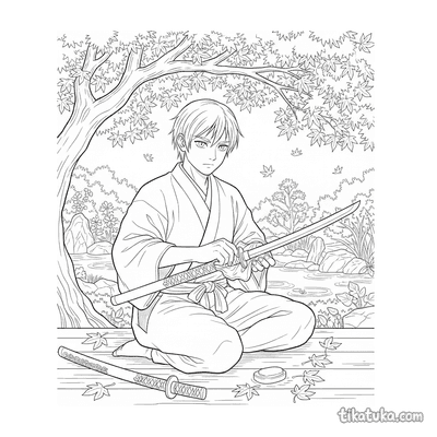 Samurai Apprentice Polishing Katana Under Maple Tree