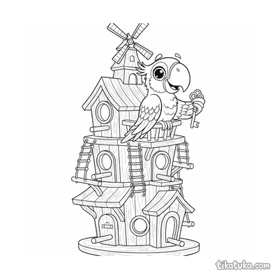 Parrot Peeking from Fancy Multi-Story Birdhouse
