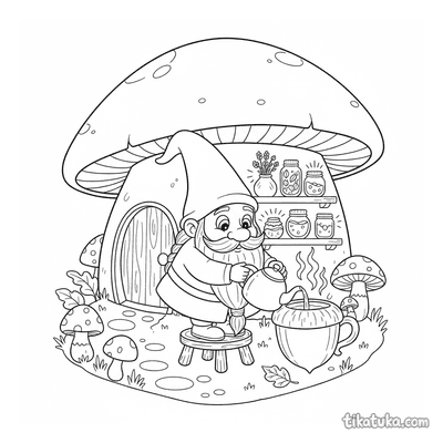 Gnome Brewing Tea in a Whimsical Mushroom House