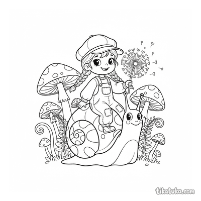 Girl Riding a Snail in Mushroom Forest